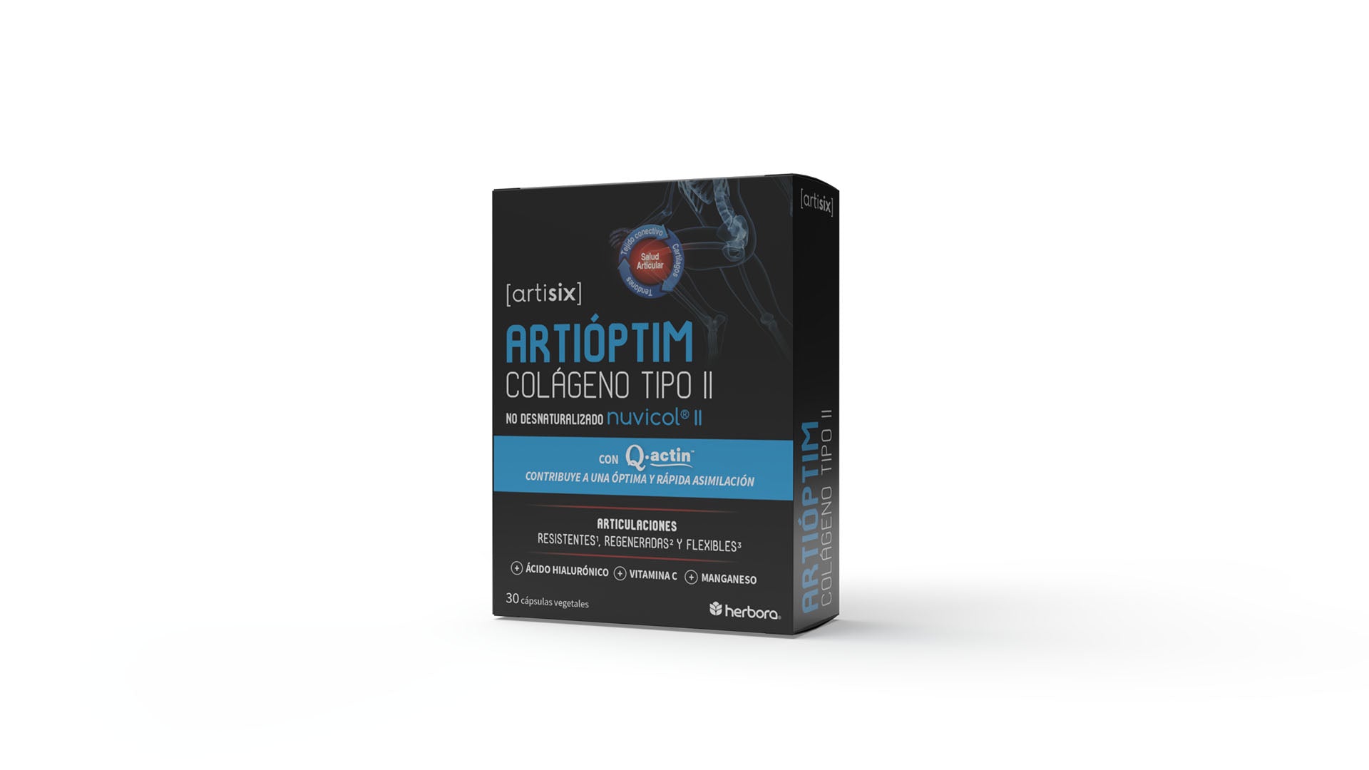 Artióptim Colágeno Tipo II de Herbora ha sido formulado para ofrecer una respuesta eficaz y completa. Contiene dos principios activos patentados denominados Nuvicol-II®, un tipo de colágeno tipo II no desnaturalizado que ayuda en la salud articular y Q-actin®, un extracto de pepino con efecto antiinflamatorio demostrado clínicamente en tan solo 5 días. Completan la fórmula el ácido hialurónico, la vitamina C y el manganeso. Una solución innovadora para mantener unas articulaciones fuertes, flexibles y funcionales.