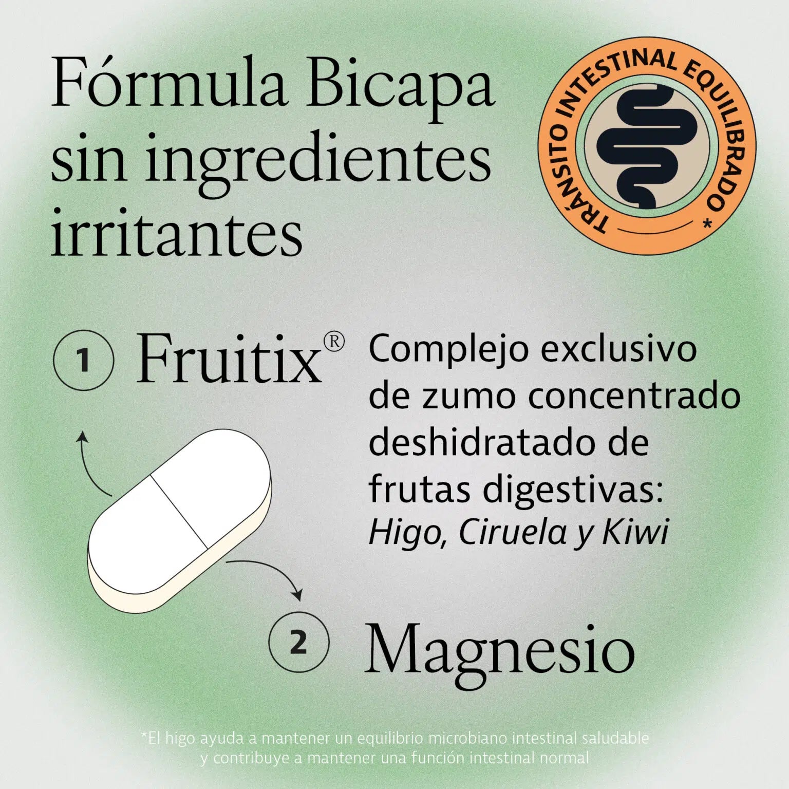 - Ingredientes: Óxido de magnesio, Agente de carga (celulosa), Fruitix® (Complejo de zumo concentrado deshidratado de los frutos de Higo Ficus carica), Ciruela (Prunus domestica) y Kiwi (Actinidia deliciosa)), Antiaglomerantes (carboximetilcelulosa sódica entrelazada, diglicérido de ácidos grasos, sales magnésicas de ácidos grasos, dióxido de silicio).